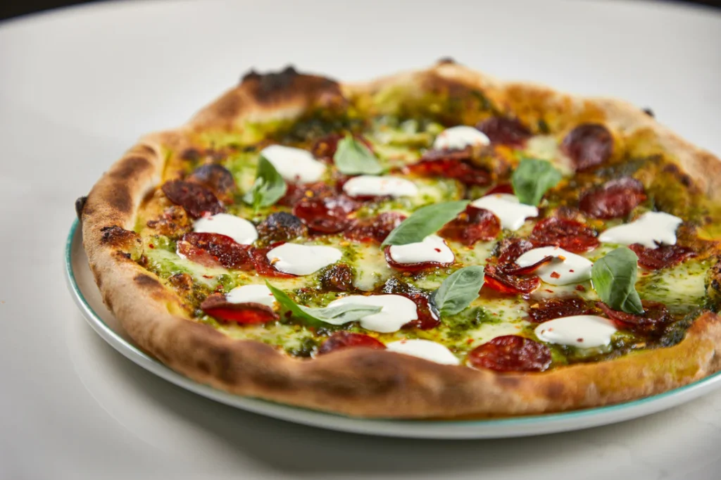 Pizza Bianca s mozzarellom, svježim bosiljkom, salamom i čilijem